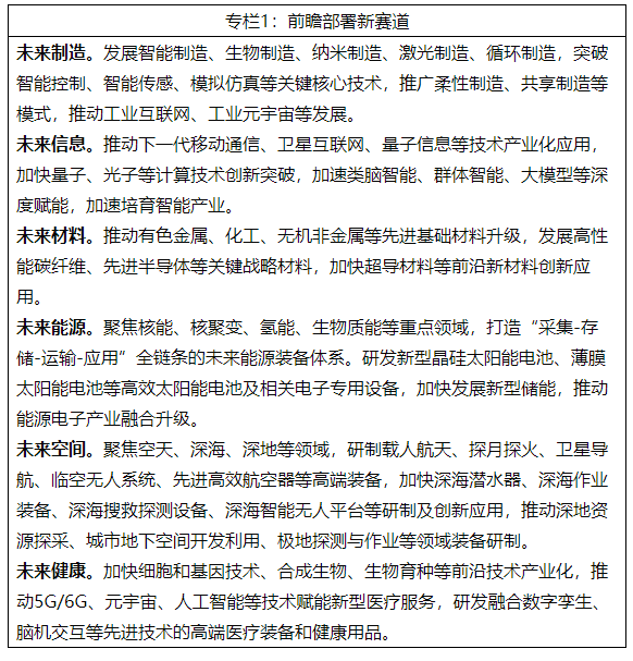 1.加强前瞻谋划部署。把握全球科技创新和产业发展趋势,重点推进未来制造、未来信息、未来材料、未来能源、未来空间和未来健康六大方向产业发展。打造未来产业瞭望站,利用人工智能、先进计算等技术精准识别和培育高潜能未来产业。发挥新型举国体制优势,引导地方结合产业基础和资源禀赋,合理规划、精准培育和错位发展未来产业。发挥前沿技术增量器作用,瞄准高端、智能和绿色等方向,加快传统产业转型升级,为建设现代化产业体系提供新动力。