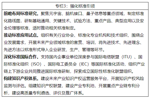 13.加强标准引领与专利护航。结合未来产业发展需求,统筹布局未来产业标准化发展路线,加快重点标准研制。针对重点标准适时开展宣贯和培训,引导企业对标达标,加速未来产业标准应用推广。促进标准、专利与技术协同发展,引导企业将自主知识产权与技术标准相融合。完善关键领域自主知识产权建设及储备机制,深化国际国内知识产权组织协作,构建未来产业高质量专利遴选、评价及推广体系。