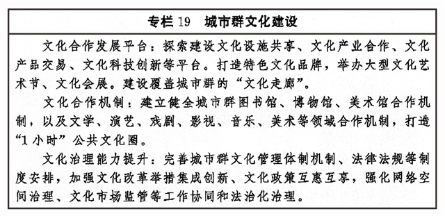 加强区域文化协同创新,健全合作互助、扶持补偿机制,推动东部地区以创新引领文化发展,加大力度支持中西部地区以及东北等老工业基地文化发展,扶持革命老区、民族地区、边疆地区文化发展,形成相互促进、优势互补、融合互动的区域文化发展格局。围绕京津冀协同发展、长江经济带发展、粤港澳大湾区建设、长三角一体化发展、黄河流域生态保护和高质量发展等区域重大战略,健全推进区域内文化协同发展机制,提升公共文化设施互联互通水平,加强区域文化产业带建设,实现区域文化建设水平整体提高。促进形成文化产业发展新格局,创新城市群文化一体化发展体制机制,共建高水平合作平台,加强公共文化服务便利共享。完善以城带乡、城乡融合的文化发展体制机制,发挥城市带动辐射作用,加快城乡间文化要素双向流动,形成以点带面、特色鲜明、优势互补、均衡配置的城乡文化发展新格局。